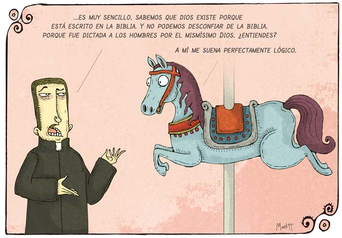 « Por si no os dáis cuenta a primera vista, el razonamiento que hace el cura sobre la existencia de Dios no es más que una especie de lógica circular, o lo que es lo mismo, demostrar algo utilizandose a sí mismo. Es decir, un absurdo. Pero el caballo lo entiende perfectamente porque toda su vida se basa en dar vueltas a lo mismo. Muy ingenioso. »